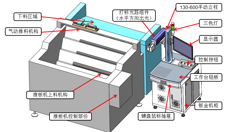 在核工业领域,核螺栓作为关键部件,其标识的精准性与永久性至关重要,关乎核设施运行的安全性与可追溯性。激光打标具有非接触式加工的特点,不会对核螺栓的物理性能造成损伤,确保核螺栓原本的高强度、高密封性等关键性能不受影响。 从整体外观来看,设备主要由推板机上料机构、推板机控制部分、气动推料机构、下料区域、打标光路组件(水平方向出光)、130 - 600手动立柱、三色灯、显示器、控制按钮、工作台铝板、钣金机柜、键盘鼠标抽屉等部分组成。其整体尺寸经过精心设计,能适应多种工作场景。 打标精度极高,可在核螺栓表面精准呈现规格型号、生产批次、追溯编码等各类标识信息。标识线条精细清晰,即便面对微小字符或复杂图案,也能精准刻画,满足核工业对标识高精度的严苛要求 而且,激光打标具有永久性,标识能长期保持清晰。在核设施复杂、恶劣的运行环境下,历经长时间的高温、高压、辐射等考验,依然不会出现褪色、模糊等情况,为核螺栓的全生命周期追溯提供可靠保障。 螺栓激光机的工作流程高度自动化、智能化。首先,人工将成捆螺栓吊运至推板机料仓内。按下推板机启动按钮后,打标阻挡机构与气动挡块机构顶出,推板机开始送料,将螺栓精准送至打标工位。 当传感器感应到打标工位有工件后,推板机再次送料,气动推料机构将工件侧顶靠位后退回,打标阻挡机构退回避让出打标位置,打标机随即开始工作。打标完成后,气动挡块机构退回,传感器感应到工件流出,推板机继续送料,进入下一个打标循环。 此外,设备还具备智能报警功能,若3分钟内传感器感应不到工件,便会报警提示人工上料,有效避免因缺料导致的生产停滞,保障生产的连续性与高效性。 该设备适用范围广泛,可满足M12至M41规格核螺栓的打标需求。对于不同长度的核螺栓工件,换型时仅需人工调整气动推料机构的安装固定位置,操作简便,能快速适应不同规格核螺栓的打标生产,为核工业企业提供了灵活、高效的打标解决方案。