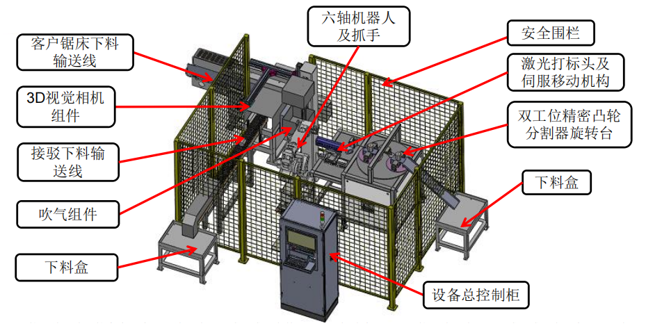该工作站采用六轴机器人+100W激光打标机+双工位精密旋转台+3D视觉定位的一体化布局,是专为六方钢设计的打标单元。可实现六方钢三个面的旋转打标,打标内容覆盖字符、LOGO;产线节拍≤14s,在保证打标精度的同时,完美匹配自动化产线的效率要求;工作站无缝对接自动化锯床下料单元,设备布局与尺寸可根据产线实际需求调整(以图纸会签为准),能快速融入现有生产链路,减少产线改造的时间与成本。